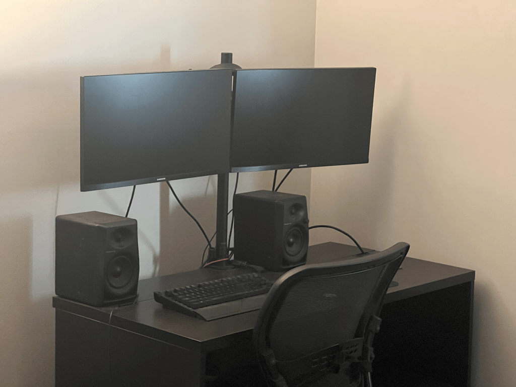 Two 2560×1440 monitors and bookshelf speakers for maximum productivity! Monitor connections include displayport, hdmi, and thunderbolt 3 (with power delivery).