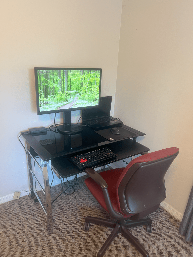 A single 3440×1440 [ultrawide] monitor. Monitor connections include displayport, hdmi, and thunderbolt 3 (with power delivery). This office includes a very spacious corner desk and a wall mounted TV for entertainment purposes in between work.